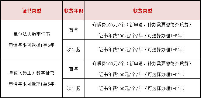 新申请单位员工证书1个:100*年限+介质费。例:新申请1个单位员工证书3年有效期,100*3+100=400元。