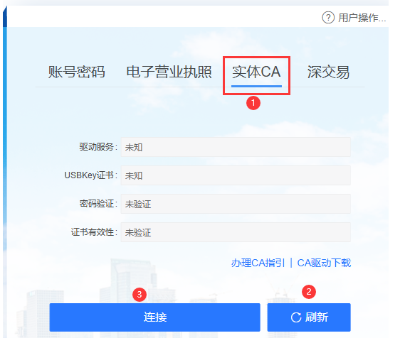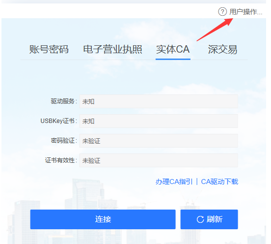 实体CA--点击刷新,读取证书信息后,点击连接,输入证书密码,完成登录操作。